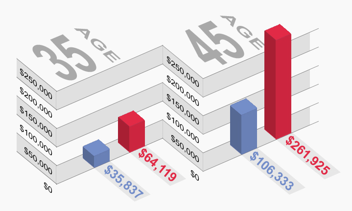 Angie also earns $50,000 a year and enrolls in her retirement plan at age 25. She decides to contribute 5% with a 1% increase every year for 20 years. Angie’s account balance at age 45 is $261,925, assuming her salary remains unchanged!