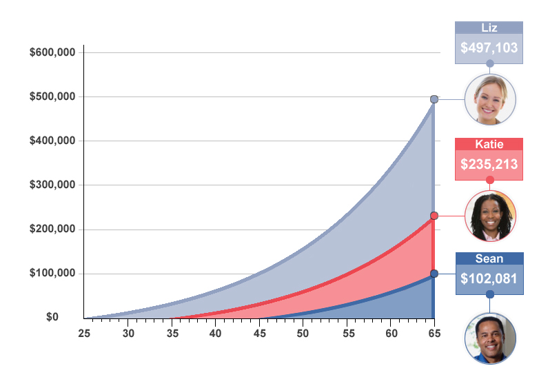However, Liz starts early—beginning at age 25—and has $497,103 by the time she’s age 65!